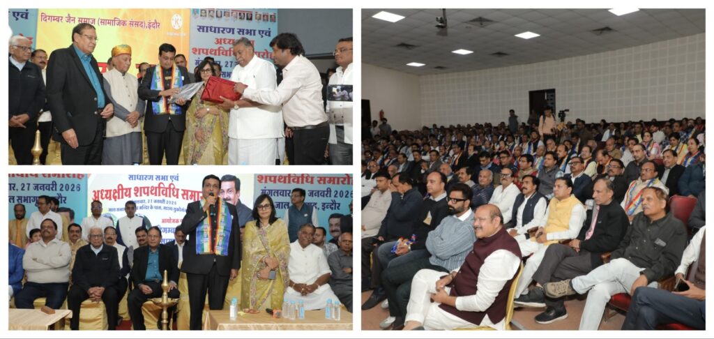 इन्दौर। दिगम्बर जैन समाज (सामाजिक संसद), इन्दौर के इतिहास में 27 जनवरी का दिन एक नई एकता, समन्वय और विश्वास का प्रतीक बन गया, जब एक गरिमामय और भावनात्मक समारोह में विनय बाकलीवाल ने अध्यक्ष पद की शपथ ली। शपथ से पहले और बाद तक सभागृह में बना वातावरण केवल एक औपचारिक आयोजन नहीं, बल्कि वर्षों से चली आ रही सामाजिक दूरी को पाटने का सशक्त संकेत था।